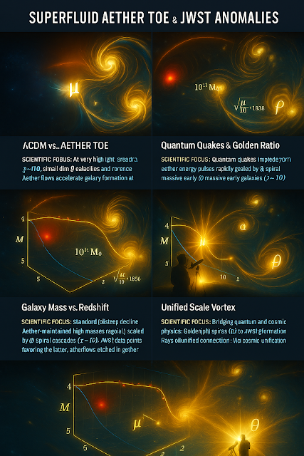 "Today, we’re going to explore a bold new idea — the Superfluid Aether Theory of Everything — and how it might resolve one of the James Webb Space Telescope’s most intriguing puzzles: the existence of massive, mature galaxies in the infant universe. We’ll move from the problem, to the mechanism, to the data, and finally to a unifying vision that connects the smallest particles to the largest cosmic structures."